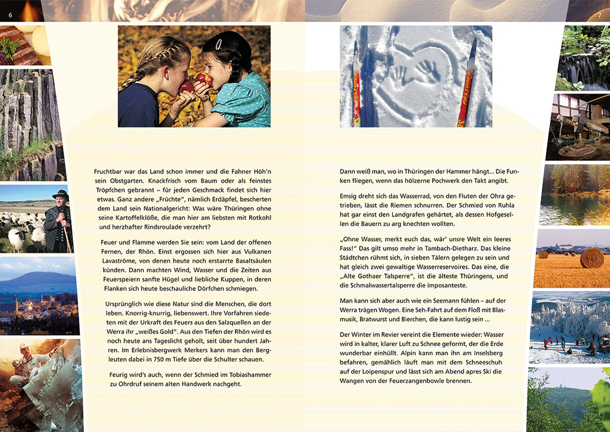 Klare Gliederung muss nicht rechtwinklig sein. Der Schwung steht natürlich für Berglandschaft, bringt darüber hinaus Dynamik und einen größeren Aufmerksam­keitswert. Die Farbigkeit Gelb/Grün war vorgegeben, kombiniert mit Weiß & Himmelblau ergibt sich eine fröhliche Frische. Die Idee war, das Layout über die Rückseite fortzusetzen.